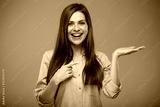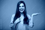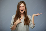 Smiling business woman holding empty hand and pointing finger. isolated female portrait.