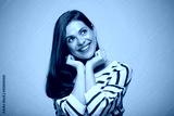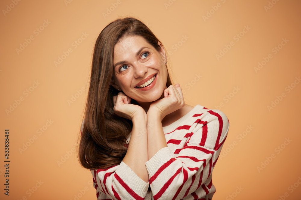 Happy smiling woman with wide big toothy smile looking up. Isolated female portrait.