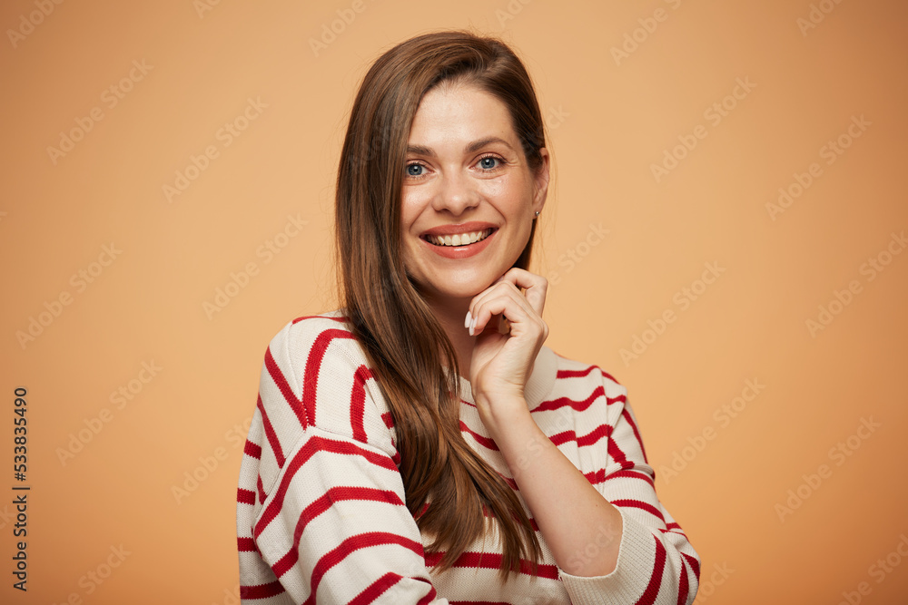 Beautiful smiling woman with long hair wearing casual striped shirt. Isolated female portrait.
