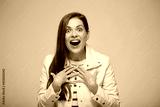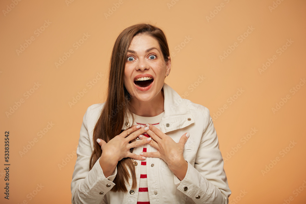 Surprised woman in white casual jacket makes hands gesture. isoalted portrait on yellow background.