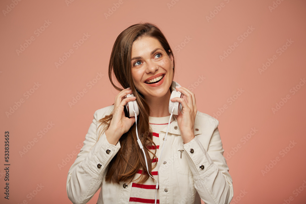 Smiling woman with long hair dressed casual with white oldschool headphones looking away. Isolated female portrait on pink.
