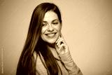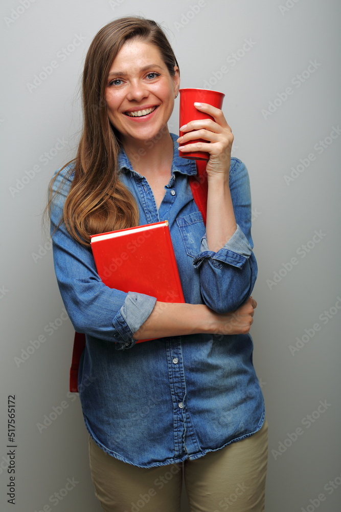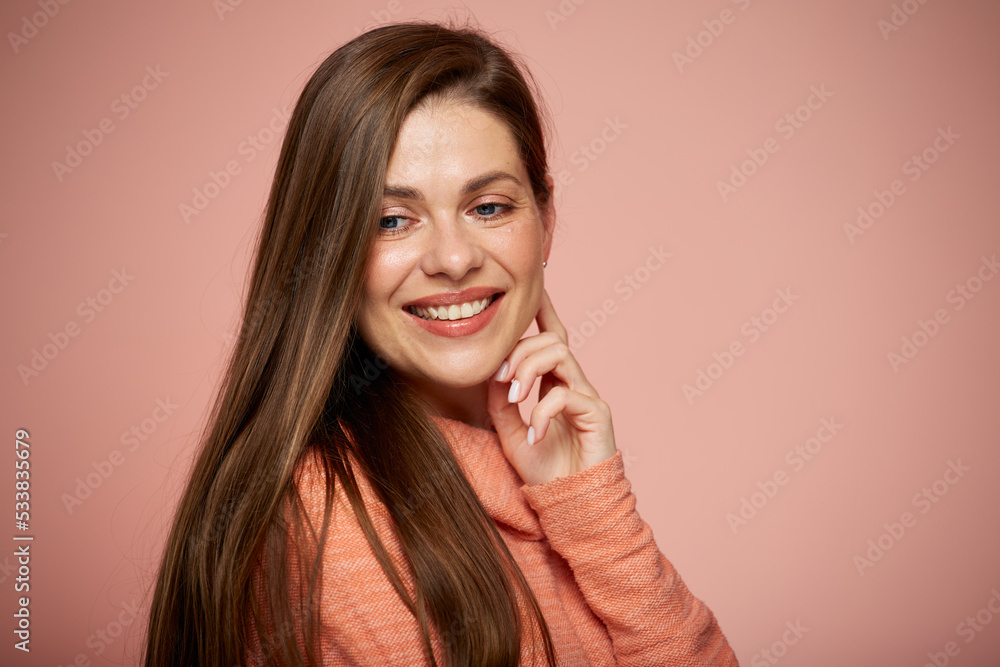 Close up female face with natural real skin. Isolated portrait on pink background. Girl touching her face and looking away.