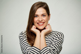 Smiling woman face close up portrait with natural skin isolated on white background.