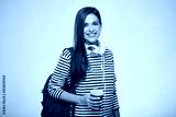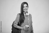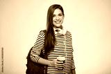 Adult student with coffee cup. Modern woman isolated portrait in teenager style on white background.