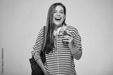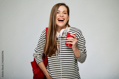Happy female student with book and red coffee glass isolated portrait on white background.