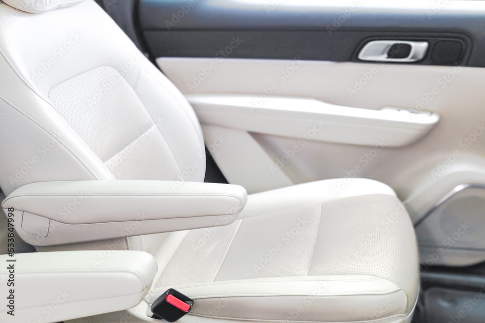 Closeup unmanned white leather car seat