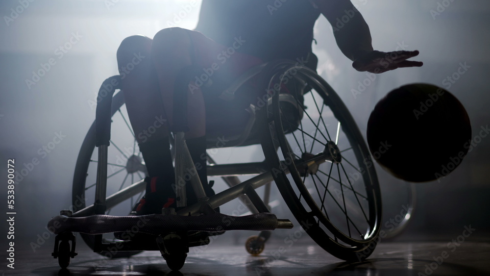 Disabled basketball player in wheelchair with dramatic lighting. Athlete with disability hard backlight
