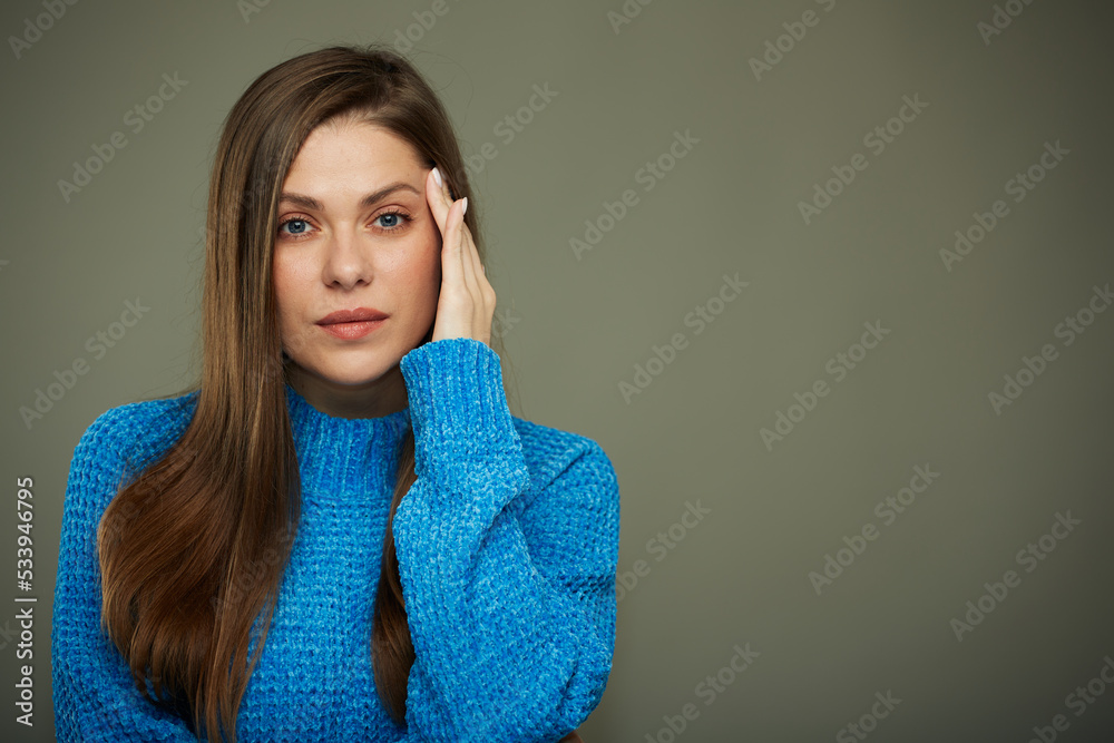 Woman in blue sweater with headache.