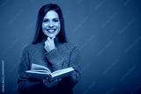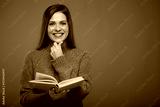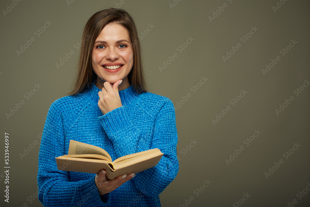 Thinking teacher woman with book wearing warm winter clothes holding open book. isolated female portrait.