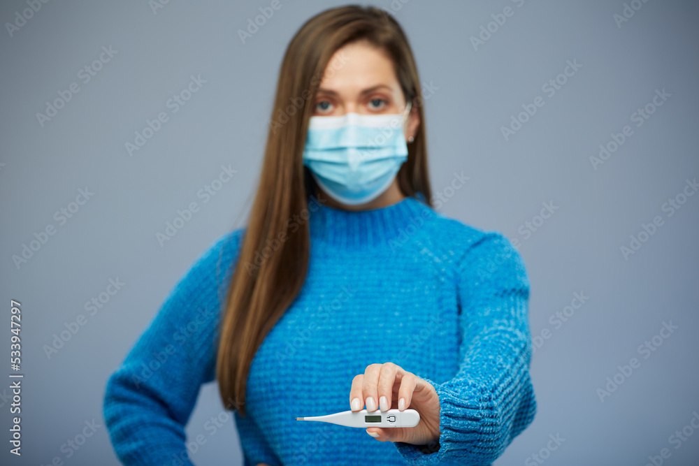 Woman wearing blue medical mask showing thermometer. Health and medical isolated concept portrait.