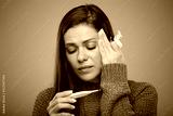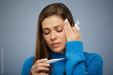 Sick woman looking on medical thermometer isolated portrait. Isolated close up female face portrait.