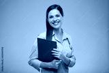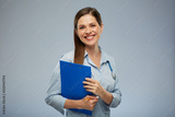 Happy smiling doctor woman in blue medical uniform. Isolated portrait of female medical worker