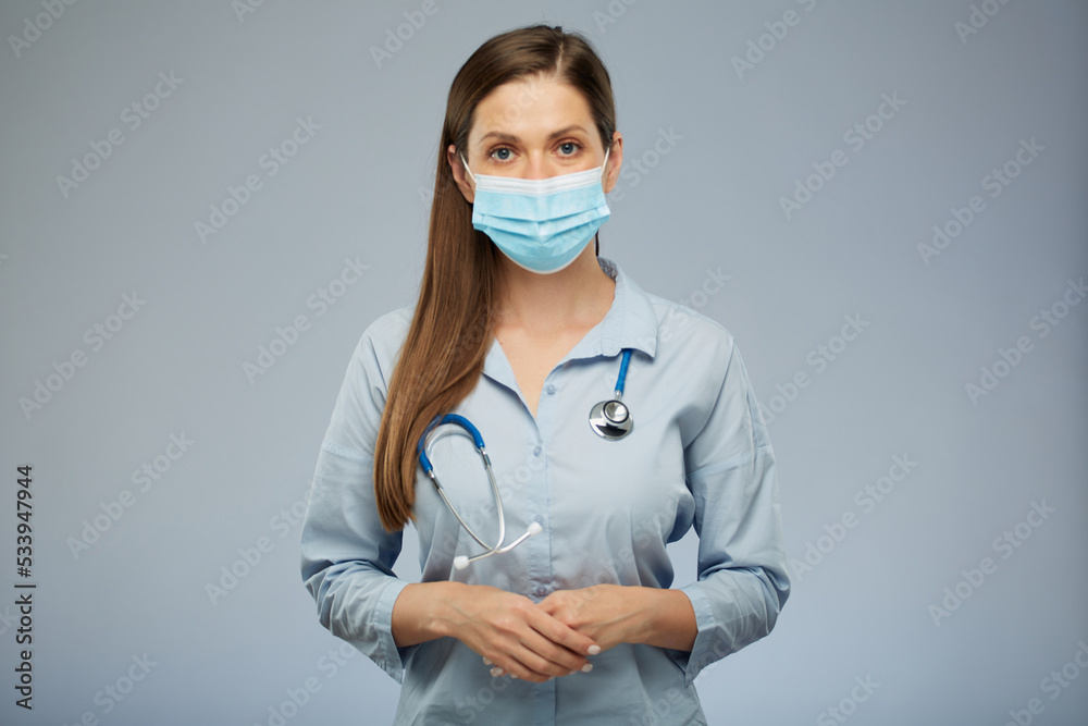 Doctor woman wearing safety mask. Isolated portrait of female medical worker