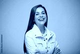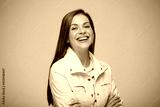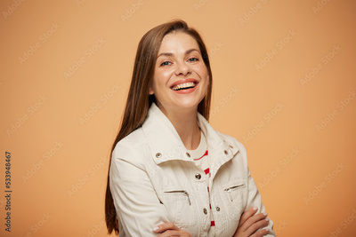 Smiling woman in white jacket isoalted portrait on yellow background.