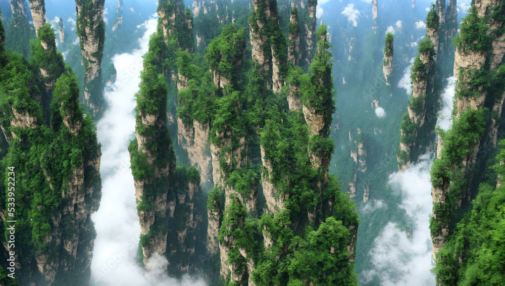 Hallelujah Mountains, Floating Mountains, Zhangjiajie, Wulingyuan Senica Area, rock formations, Plateau, mountain, landscape, nature, sky, mountains, fog, trees, forest, clouds, view, travel, panorama