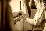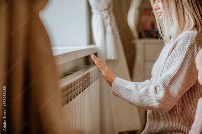 Young woman in long winter beige sweater is posing at home near the radiator