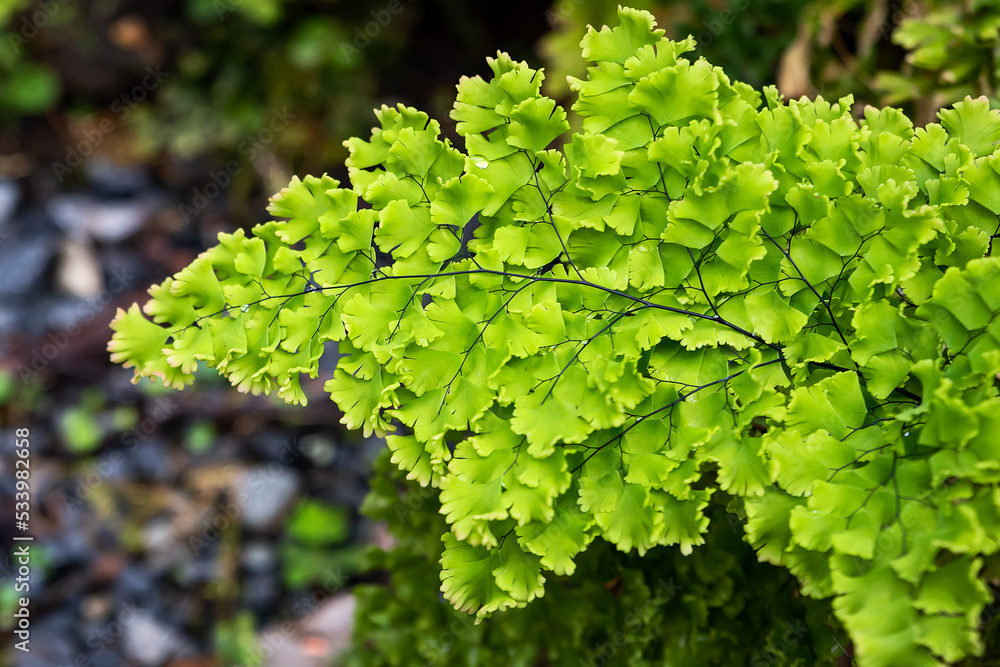 The genus Adiantum is a Maidenhair Fern. The genus name Adiantum comes from the Greek Adiantos, meaning not wet, not wet. It got its name from the fern. Some of the black stalks are not wet even when