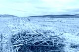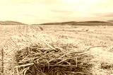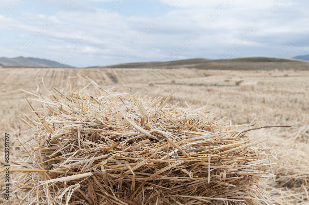 A bale of hay on a mowed field in the mountains. Mowed field.