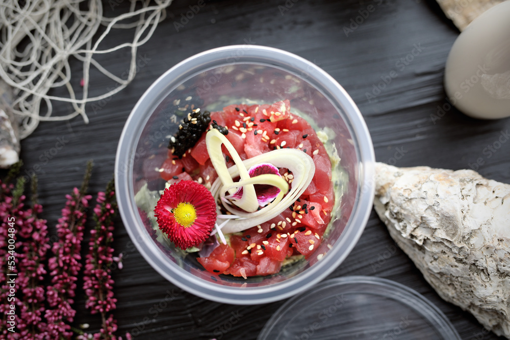 Chopped tuna tartare, with avocado and caviar, in a take-away box. An elegant appetizer in a fish restaurant.