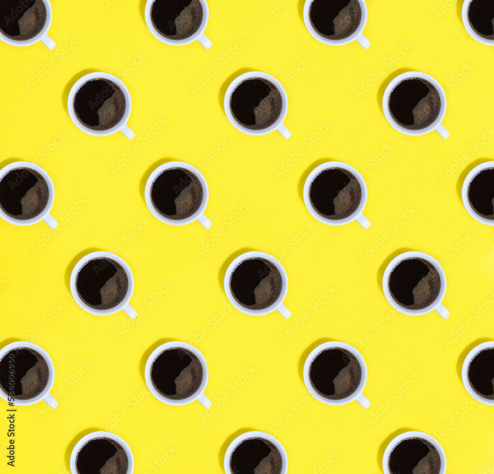 Top view of white coffee cups on the yellow background. Pattern. Flay lay.