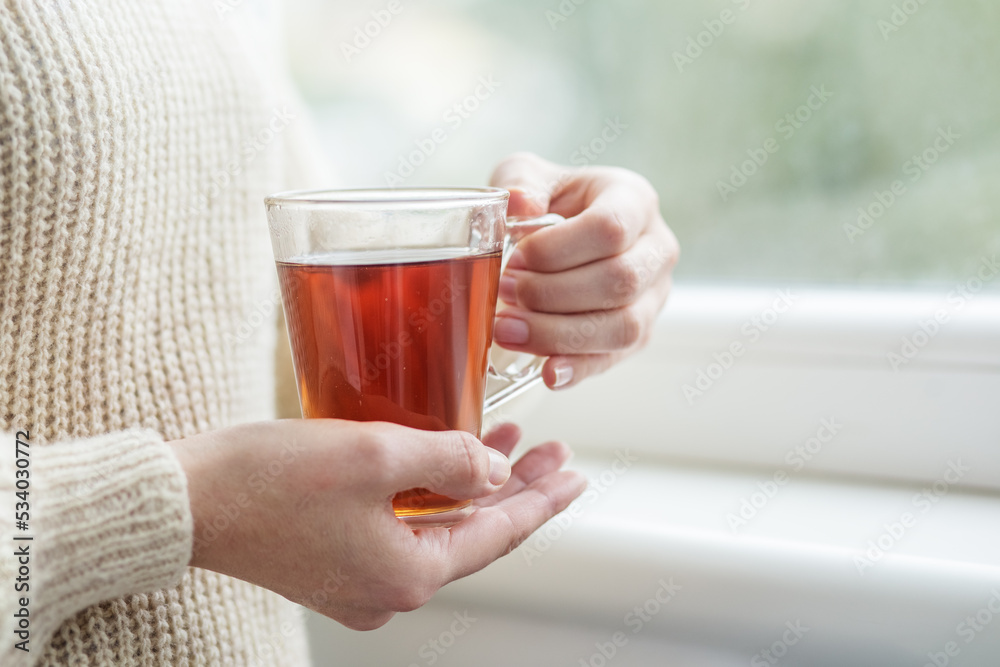 Cup of hot tea in female hands close-up. Background. Beverage concept, lifestyle, autumn and winter.