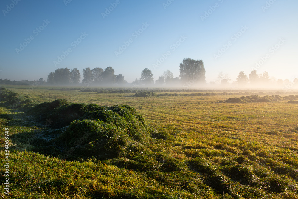 The sun rises in autumn over a freshly mowed field with the grass still lying on it. The fog hovers over the ground. The sky is blue and red.