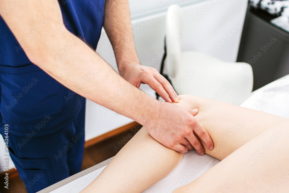 Physiotherapy leg pain exercises. Body massage in spa. Rehabilitation center. Professional medical services. Knee therapy background. Leg massage health care.