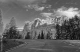 Paved alpine road winding through spruce forest with gorgeous mountain backdrop