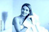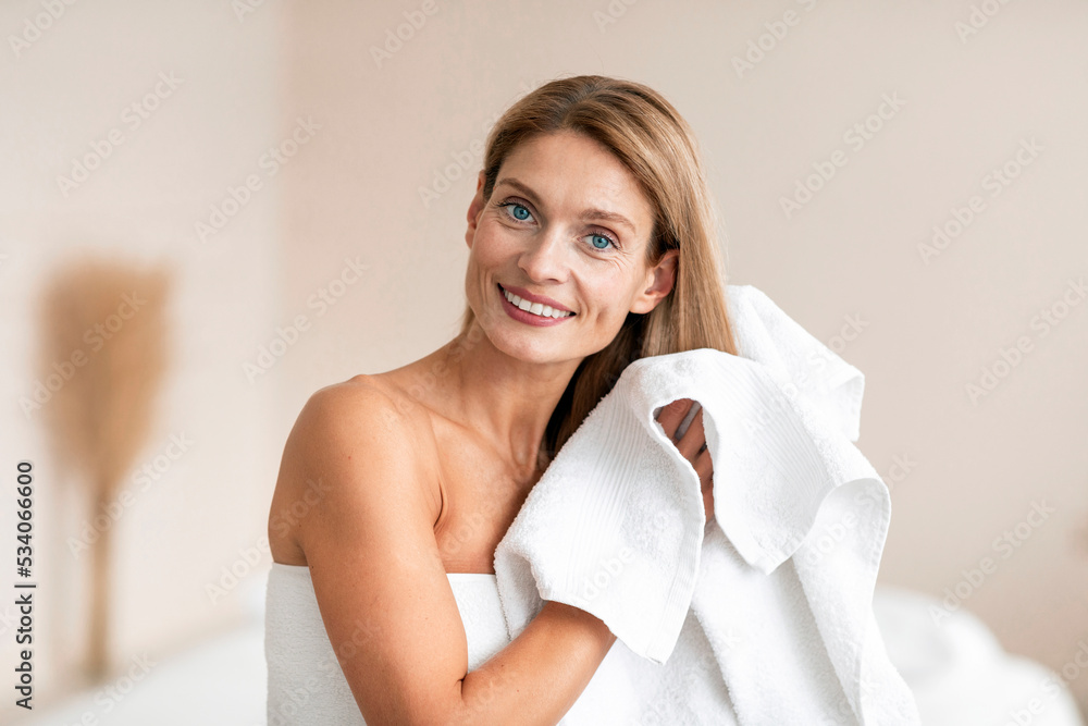 Home haircare concept. Happy middle aged woman drying wet hair with towel after shower, standing in cozy bedroom