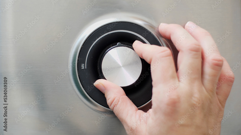 Human hand adjusting power on a power regulation knob of an electric grill