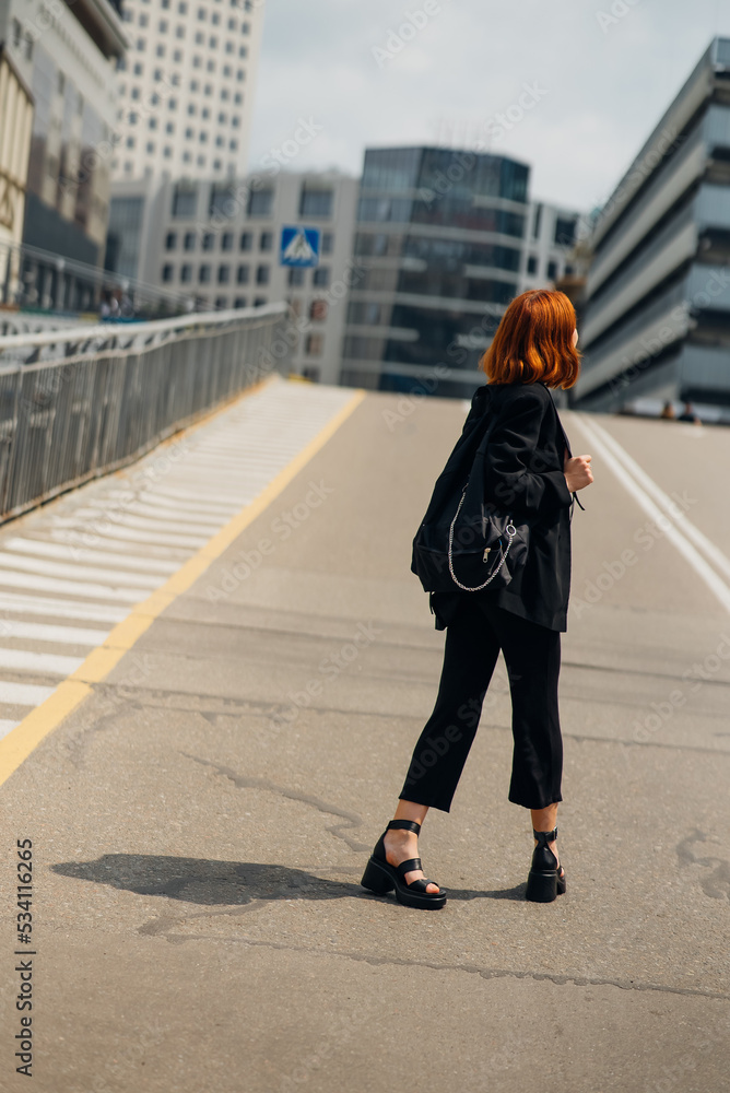 Young woman with a backpack on the road
