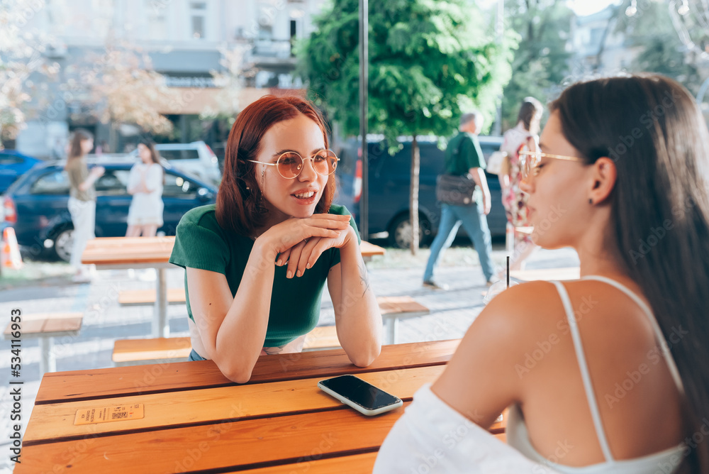 Two pretty girlfriends talking while sitting in a bar outdoors