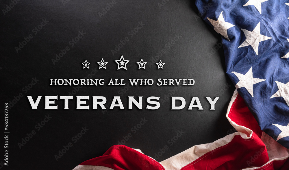 Happy Veterans day concept made from American flag and the text on dark wooden background.