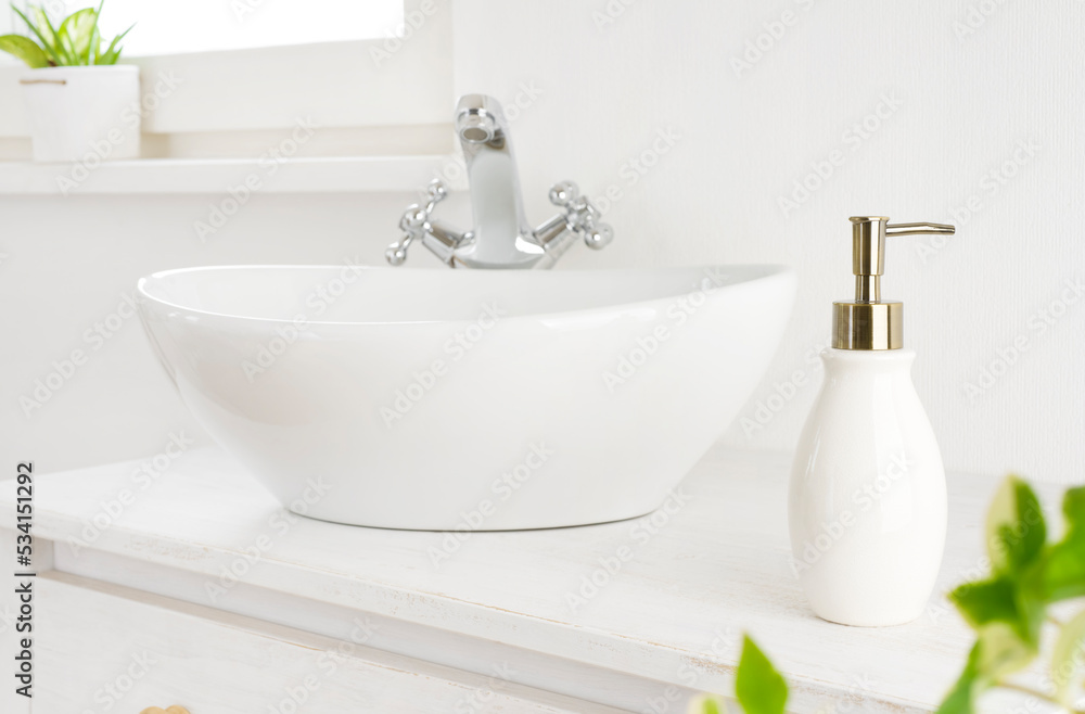 Hand washing concept with soap dispenser on washstand in bathroom