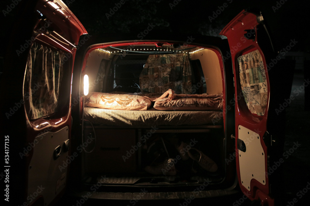 car van campervan in portugal red van renault camping sunset golden hour vacation night bed