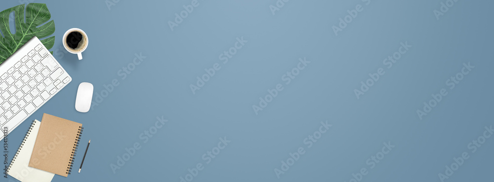 Flay lay work desk table with computer , book , coffee on blue pastel color tone background include empty space for product or text graphic advertise
