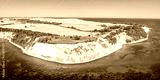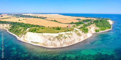 Aerial view of Kap Arkona on Rügen island at the Baltic Sea panorama with lighthouse and chalk cliffs in Germany