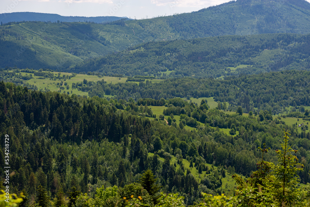 Góry, wzgórza, doliny, łąki i lasy w Beskidzie, krajobraz (2).