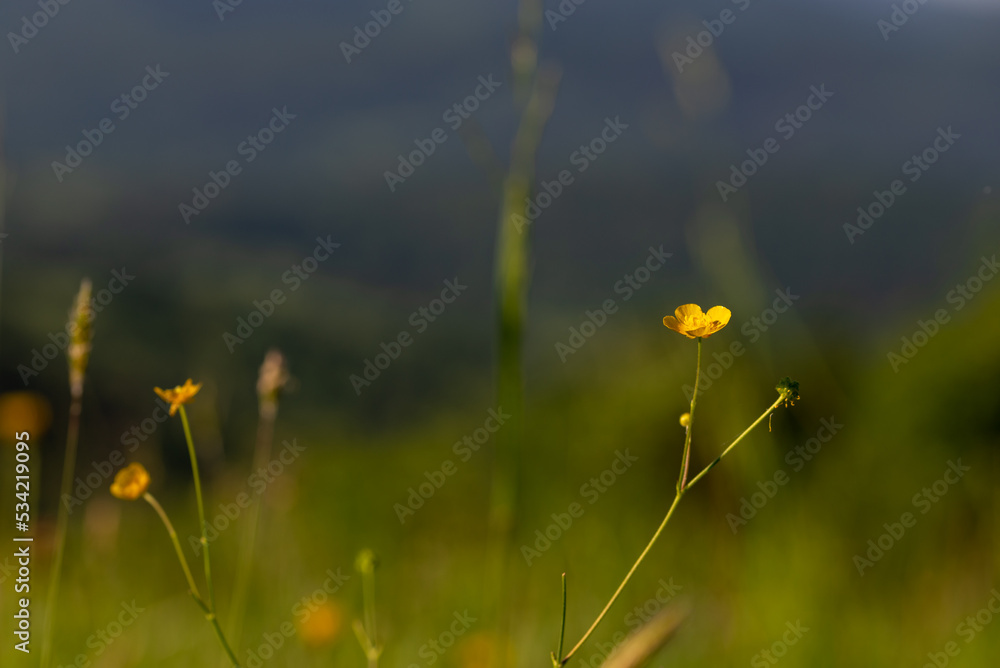Żółte kwiaty, leśna łąka, rozmyte tło.