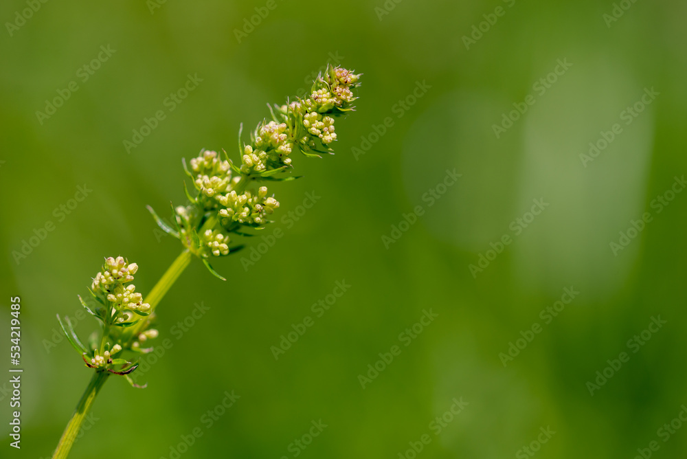 Pąki młodej rośliny, zielone rozmyte tło, ziele łąkowe.