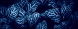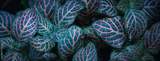 top view macro exotic tropical botanical background blue neon light emerald dark green tiny leaves plant pink line foliage.for wallpaper,leaf backdrop,natural website cover design.