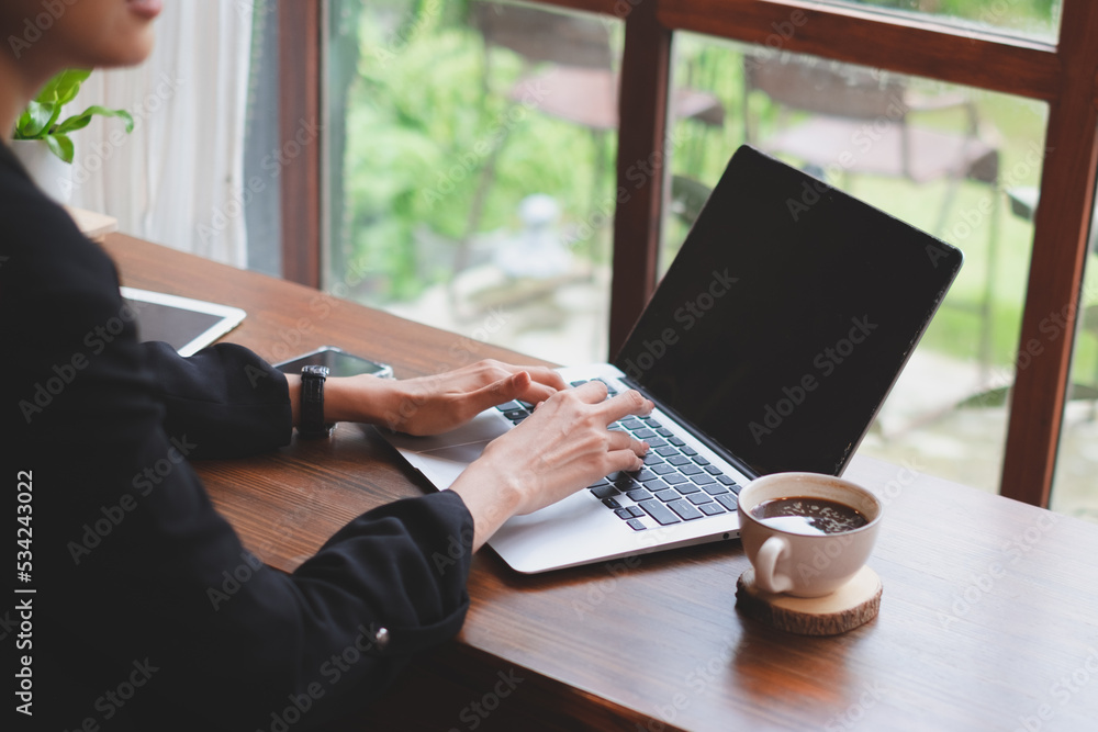 Close up of female business freelance's hands typing on laptop or notebook for searching, working, creativity and planing in coffee shop. Concept of Working online technology digital system concept.