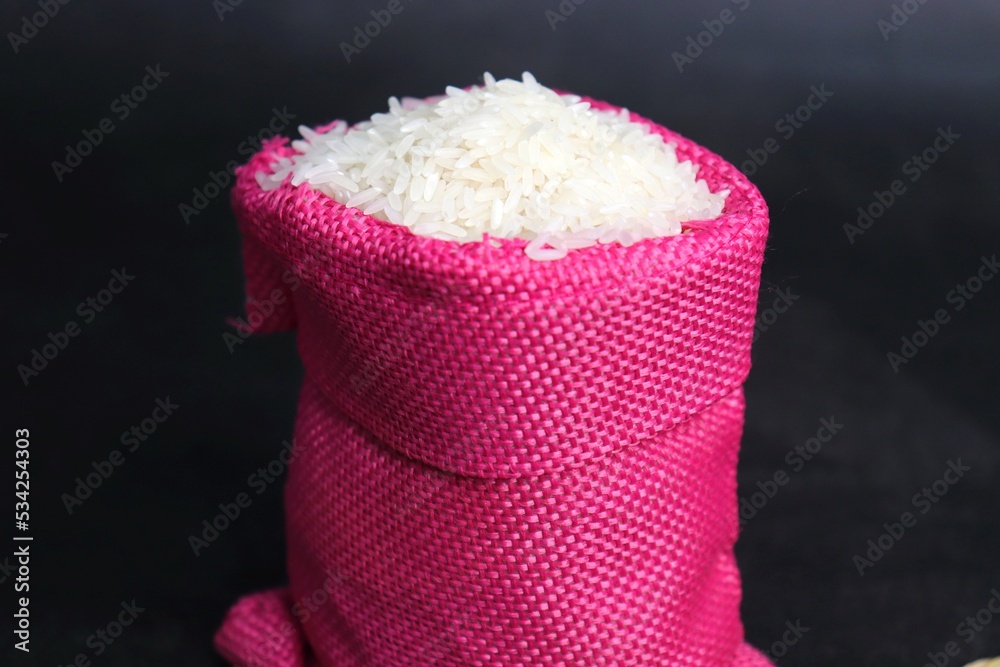 Uncooked rice with a wooden spoon. Raw surti kolam rice over black background. copy space.