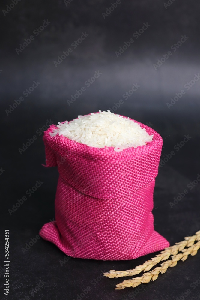 Uncooked rice with a wooden spoon. Raw surti kolam rice over black background. copy space.