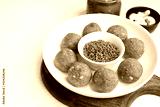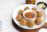 Gond and Methi Ke Laddu or Pinni. Fenugreek Laddu Made From Fenugreek Seeds, Saunf, Jaggery, and nuts. Immunity booster food for winters. Copy space