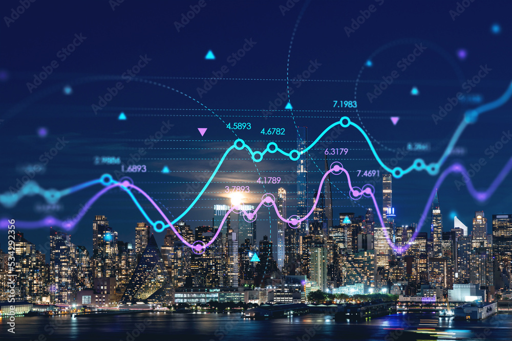 New York City skyline from New Jersey over Hudson River with skyscrapers at night, Manhattan, Midtown, USA. Forex graph hologram. The concept of internet trading, brokerage and fundamental analysis