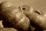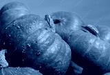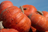 Large red Hokkaido pumpkins lie on top of each other after harvest. The sky above the fruit is blue. Earth still sticks to the pumpkins after harvest.
