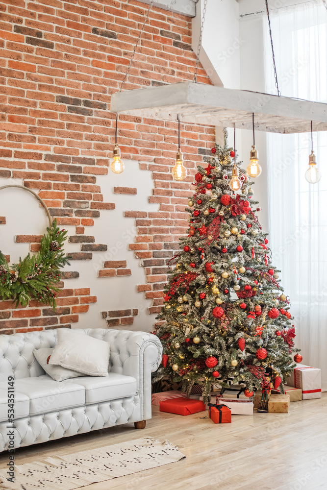 Interior of living room in loft is decorated with Christmas tree. Concept of Happy Christmas