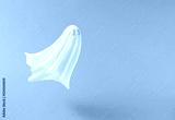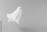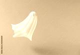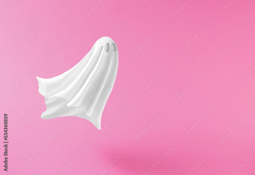 White ghost sheet costume against pastel pink background. Minimal Halloween scary concept.
