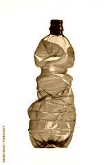 Plastic, crumpled brown soda bottle, isolated on white, close-up.